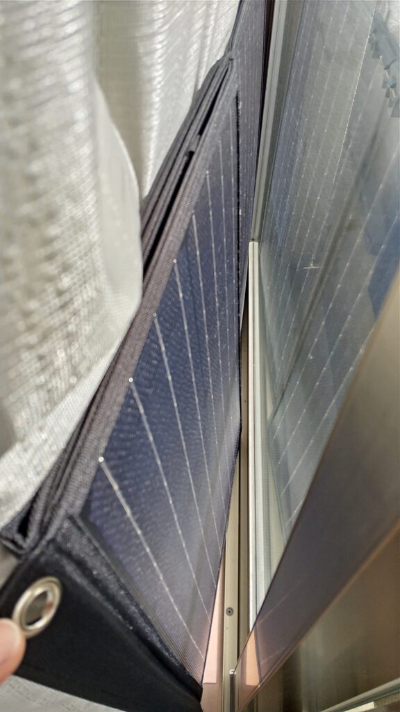 そのままソーラーパネルを窓内側とカーテンの隙間に設置してみたのです。