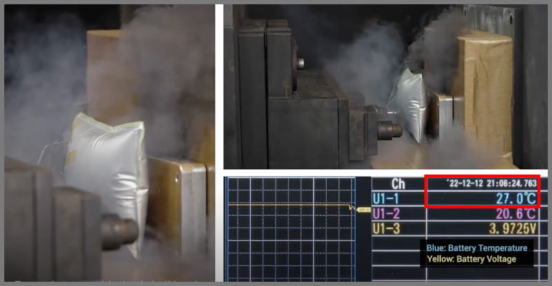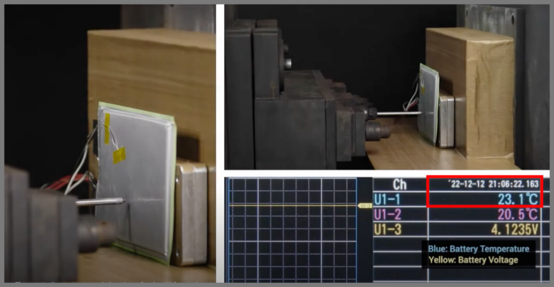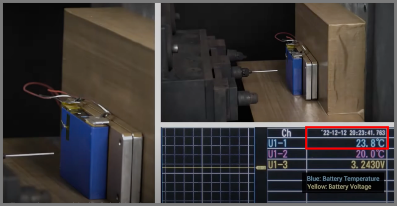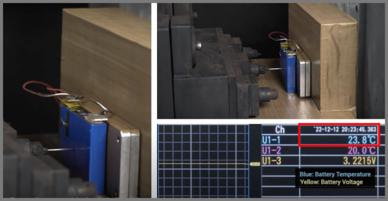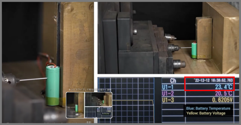 半個体リン酸鉄リチウムイオン電池へ釘を刺して貫通すると、20秒過ぎても温度上昇はなく24℃辺りを維持しているのです。