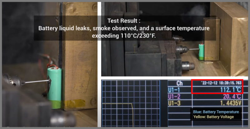 リン酸鉄リチウムイオン電池に釘をさして貫通すると液漏れ発生し100℃を超えるまで温度が上昇しています。