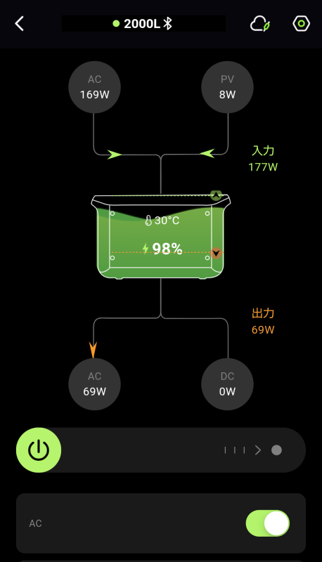 下のアプリ画面は蓄電量98%の際にAC100Vとソーラー発電の両方から供給して、空気清浄機を「強」の力で稼働させてみた時の内容となります。(試しに接続して稼働です)