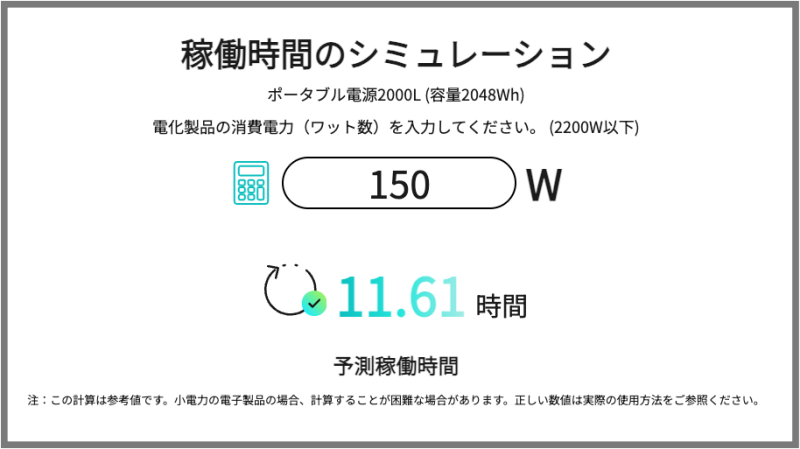 我が家での使用電力を150Wで計算してみると1048Whのダブソン2000Lでの使用可能時間は下記の様に出てきました。