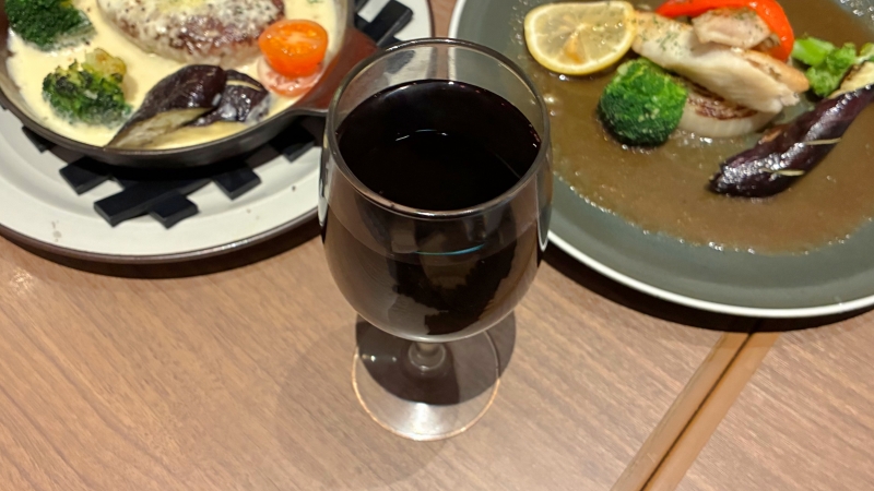 妻からの提案でアルコールも注文。午前中から赤ワインを頂きます!
