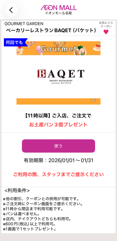 普段からも「イオンモールアプリ」にてお土産パンのプレゼントが行われており、もう一袋分はこちらの画面を提示して頂きました。 とても嬉しいサービスですね。