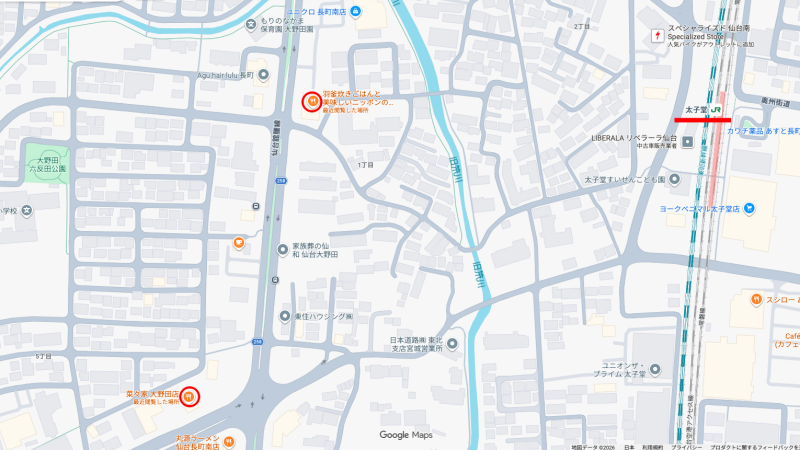地図で見ると下記のようになります。そして上記でも紹介している「ひな野 長町店」とも比較的近い距離にあるのです。