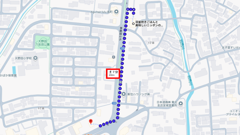 Googleマップで調べてみると450mの距離で徒歩7分と表示されていました。