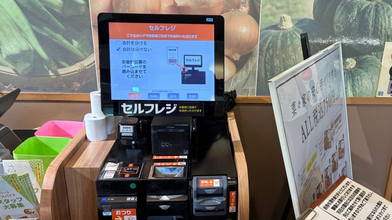 菜々家ではセルフレジを導入している事で自身で行います。こちら大野田店は現金のみ取り扱いとなります。
